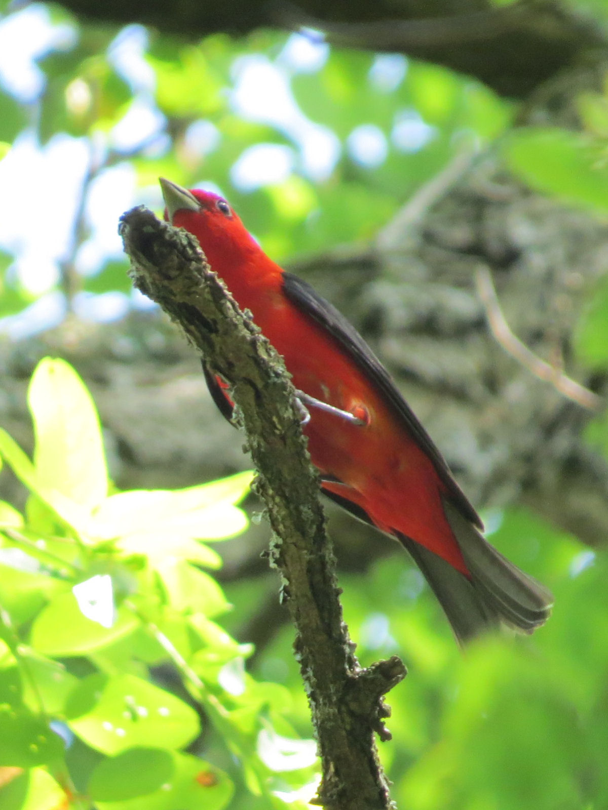 - A raspy chirp farther up ahead was coming from a male scarlet tanager.