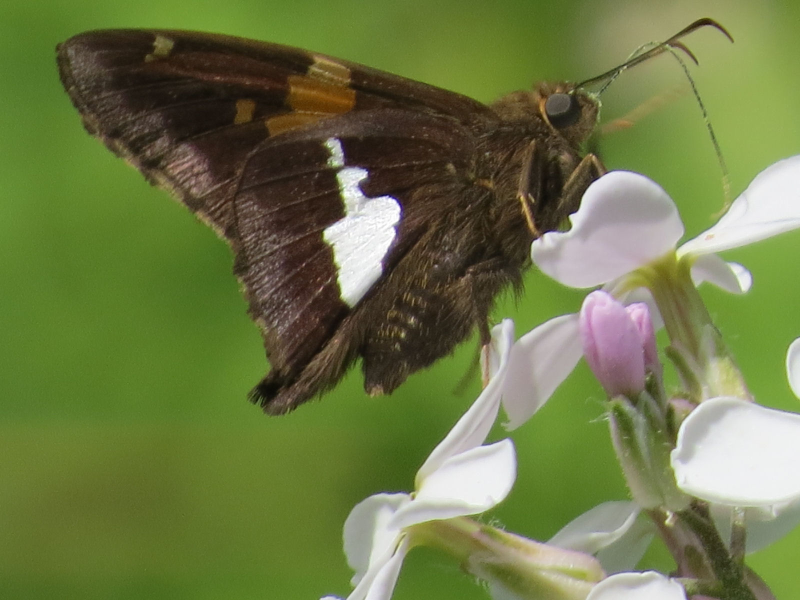 - A Silver-spotted skipper, its face dusted with pollen, was feeding on dame's rocket.