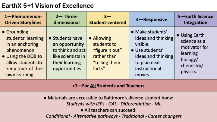 - ...support school building colleagues to increase individual and/or small group capacity, motivation and self-efficacy to enact high quality instruction aligned to the EarthX 5+1 vision; and