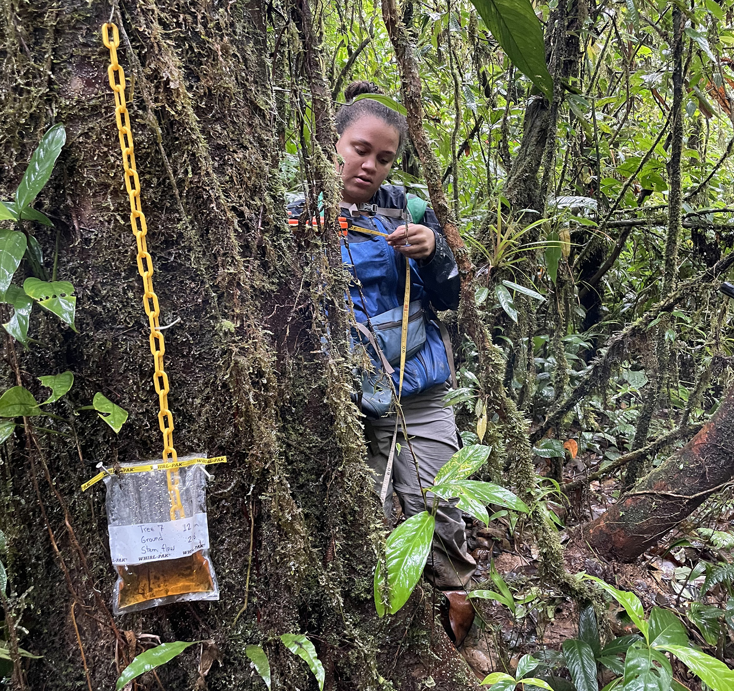 “I love climbing,” says Gano. “The perspective is just so different compared to the view from the forest floor, but it can also be scary, uncomfortable, cold, and wet. The hardest part is learning how to move around the canopy while on the rope so that you can get to the branch that you need to sample when it is on the opposite side of the tree, or it’s blocked by lianas.”