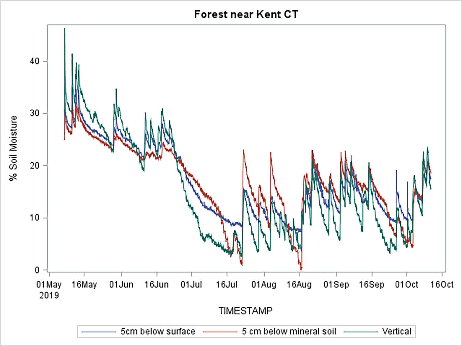 Graph showing variability in soil moisture from May through October 2019. Readings were taken at a forested monitoring site located in Kent, Connecticut.