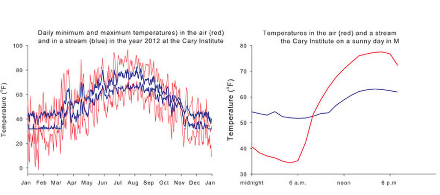 As the upper graph shows, water temperatures can be strikingly different from air temperatures right next door. Notice the stream doesn't get nearly as hot in the summer or as cold in the winter as the nearby air. How can this be?
