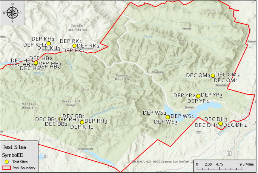 The sites I am studying are based on locations identified in The Nature Conservancy’s 2014 report on managing hemlock woolly adelgid in the Catskills. My research is focused on sites that are accessible through public or recreational land, and that represent a range of adelgid impacts, from severely impacted to healthy stands. I collect data on each tree within my plots, including diameter at breast height, percentage of canopy coverage, percentage of understory vegetation, the presence or absence of adelgid, and an overall health rating for each hemlock.
