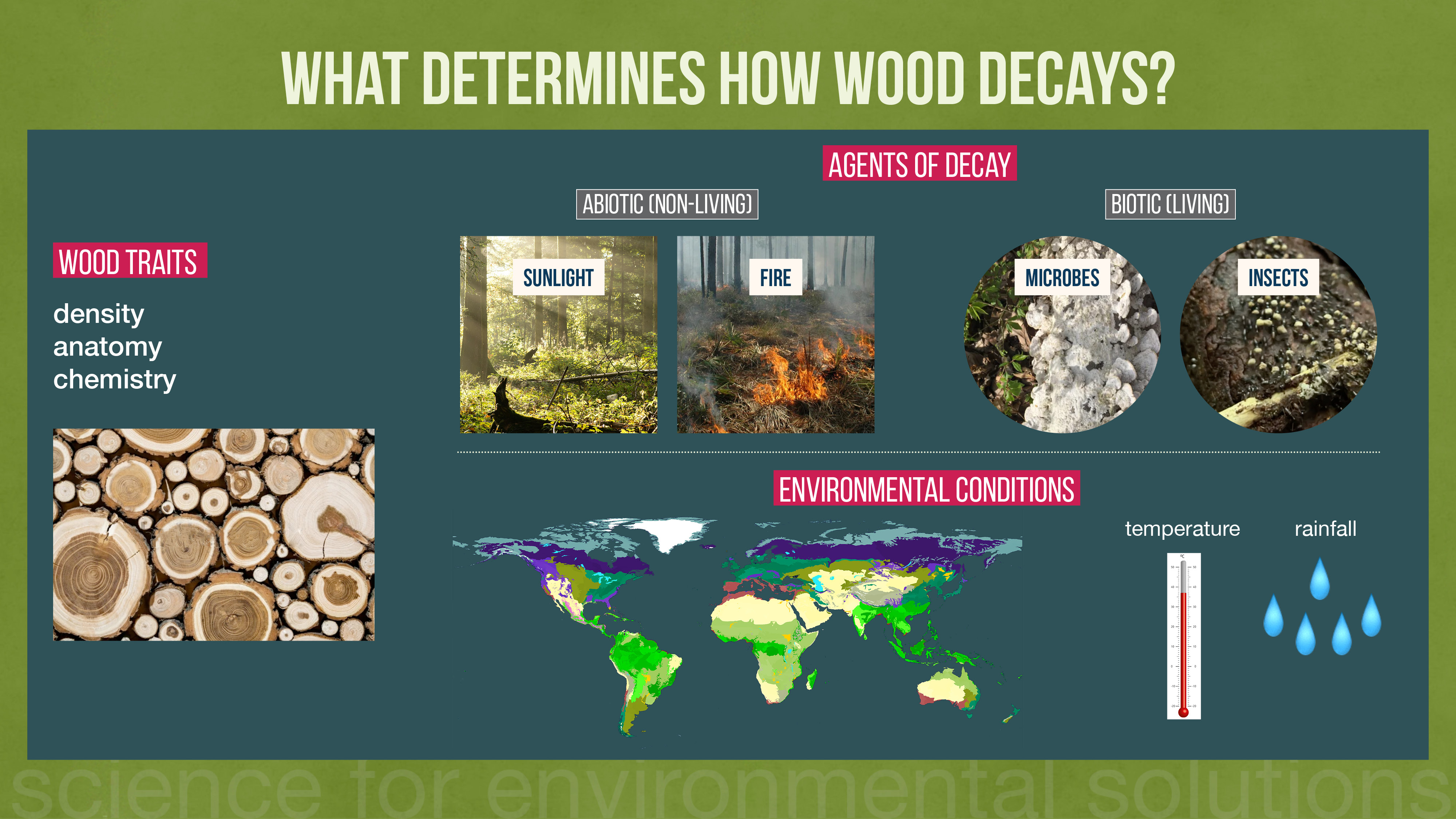 Yes, so there's, there's several interesting and interacting factors, the primary players. And it took me a little while to get to this. I started with the plant traits, but it really the players are the decayers. And so knowing who's there and around the world and how they work is incredibly important. Important. So there's two basic groups. You have, the the abiotic, the nonliving. And so there's a number of things. Fire is one of those sunlight, solar radiations. If you ever think about you have your favorite blue t shirt, and you wear it outside all the time, and all of a sudden, or you notice that it's starting to become a dull gray. That's because that your T shirt, that blue, has photo, decorative properties. And so the sunlight is degrading them. And so sunlight can be something that degrades plant material. You can also have freeze, thaw vents or leaching. And so a number of nonliving things, the other which is where I've mainly focused, are the living things. And so microbes, especially fungi are globally the most important decayer, because you find them everywhere you go. I found a good friend studies them. In Antarctica, we study them. They're the most common thing here in temperate forests. And so everywhere you find microbes, especially the fungi as decayers. The other are insects. And insects can become really important in certain places in the world, and so termites, especially are we find wood decayed termites all the way up to around the Canadian border, but they're most abundant and diverse in the tropics. And so it's really important to think of who's there, because they can have really different ways that they decompose, and they're also differently sensitive to different other factors, and those other factors, one of them are the wood traits. And so this was my gateway into studying wood decay. Was thinking about how the traits control the decay. And most of what we know is about the microbial decomposition, the fungal decomposition. Probably part of that is that most of us, who are scientists, we tend to be in temperate places, and so there's a lot of research dollars that go into understanding decay, and it's microbial decay because, because it's in our backyards. So you have traits such as the higher amount of carbon, especially as lignin is means slower decay, higher or lower nutrients also slower decay, nutrients like nitrogen and phosphorus, the same thing you put out as fertilizer and denser wood is often slower decaying. And so the plant, the wood traits, really matter. The other thing that really matters is the environmental conditions. And so a lot of what I've looked at is temperature and precipitation. So if you've ever made your peanut butter sandwich in your counter in a hot summer day, hot, moist summer day, and you drop it, or it falls, or you lose it for a while, you find it again, and it's covered with mold that's fungal decomposition happening there for you, if you instead, had remembered and stuck it in the fridge where it's cold and dry, it slows things down, so microbial fungal decay is faster in warm, wet places. We know that termites, like the tropics, are most diverse there, so we think that they're also sensitive to environmental conditions, but they have all these really amazing adaptations. They build and live in mounds. They have tubes that they build and things like that that protect them from the predators, but also environmental conditions. So that we think maybe they are better at dry conditions than microbes.